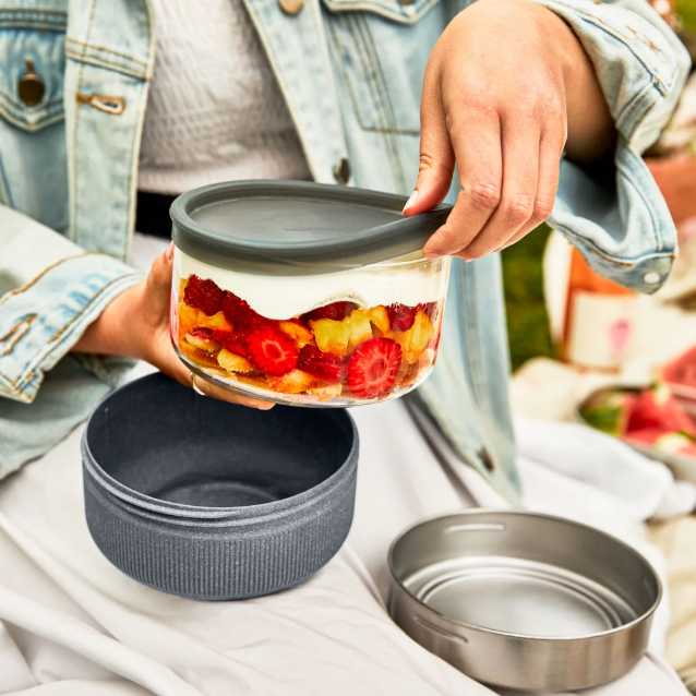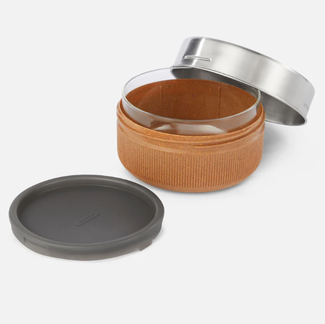 El recipiente ideal para desayunos o almuerzos: ligero, a prueba de fugas y con un volumen de 750 ml. Hecho de vidrio de borosilicato con una base protectora de fibra de madera sostenible y tapa de acero inoxidable.