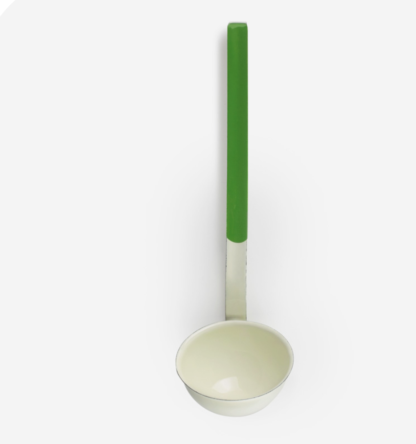 Cacillo de acero esmaltado vitrificado en tono musgo, diseñado para un toque de elegancia en la cocina. Dimensiones: longitud de 36 cm y diámetro de 9 cm. Ideal para servir con estilo y tradición.