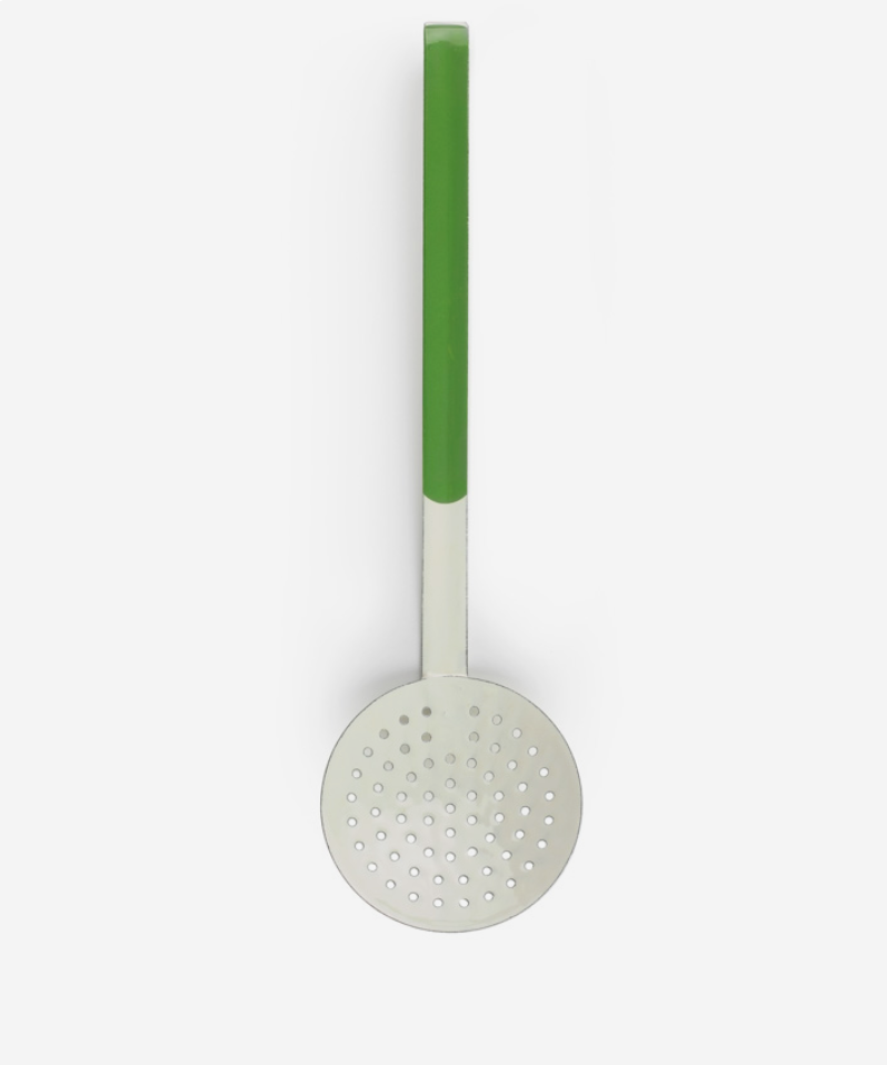 Espumadera de acero esmaltado vitrificado en elegante tono musgo. Con una longitud de 36 cm y un diámetro de 10 cm, es perfecta para servir y escurrir con estilo. Ideal para añadir un toque vintage a tu cocina.