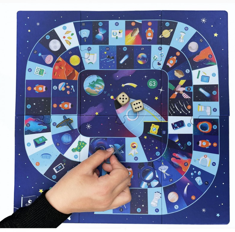 Una misión espacial se desarrolla a lo largo de la famosa espiral para llegar primero a la casilla 63. Los cohetes ayudan a avanzar más rápido, ¡pero cuidado con el agujero negro y otras casillas trampa!