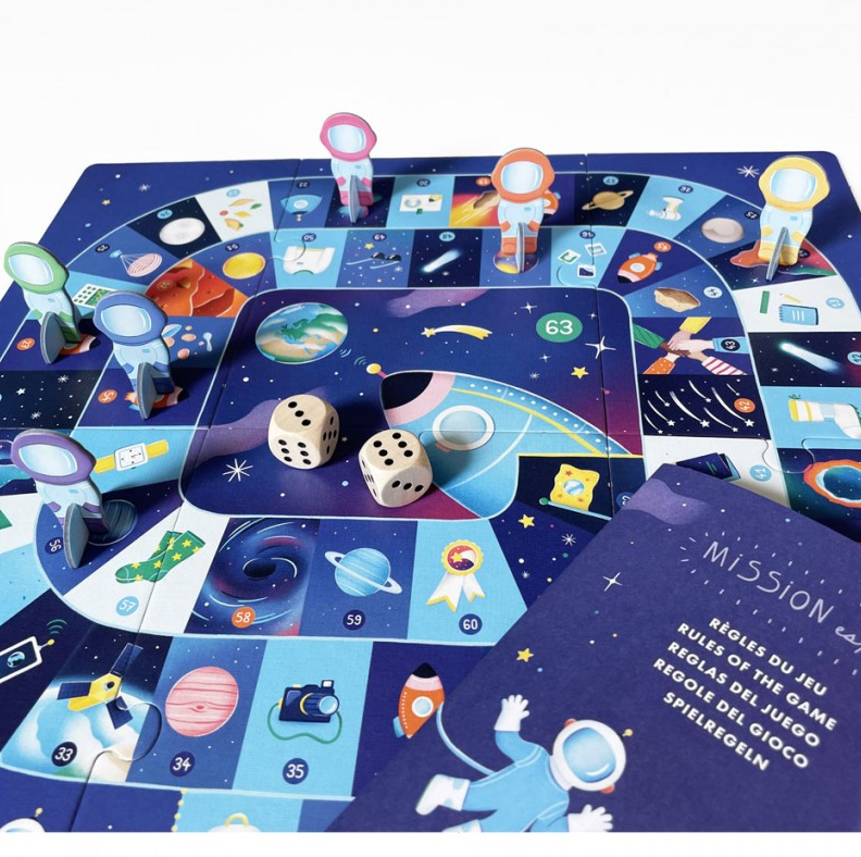 Un juego de mesa en el que los aspirantes a astronautas podrán subir por la tradicional espiral del juego de la oca para cumplir su misión y poder alcanzar el cohete que les llevará a la Tierra.