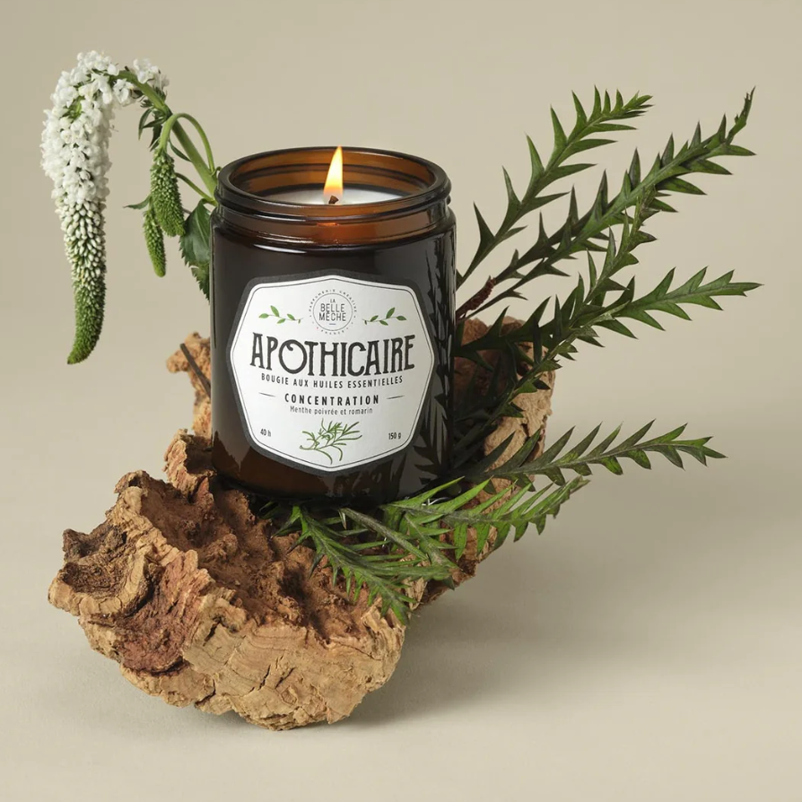 ¡Aquí está nuestra vela Apothicaire con aceites esenciales de menta piperita y romero! Basada en una sinergia de aceites esenciales conocidos por sus capacidades naturales para estimular el cuerpo y la mente, nuestra vela Concentración es ideal para dar un pequeño impulso en la oficina.